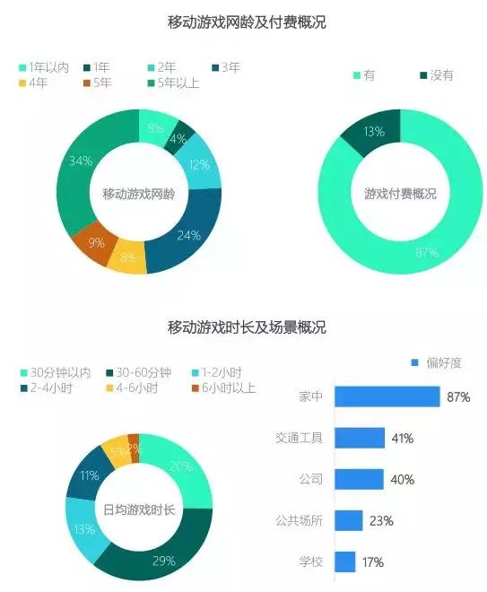 移动游戏伴随移动互联网应运而生,给予用户在移动碎片化生活中放松身心的娱乐空间,热血男儿中3/4的游戏网龄至少达到3年,87%曾为游戏付费,接近一半的日均游戏至少1个小时,而且4成以上的愿意在家中、交通工具或公司等场景下玩游戏。