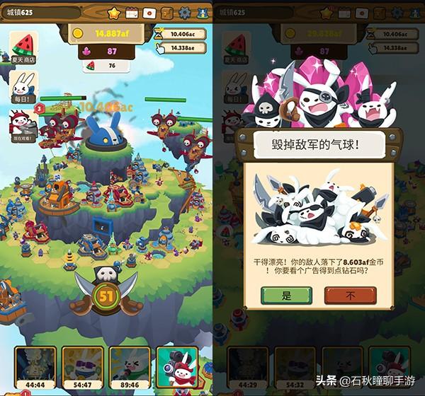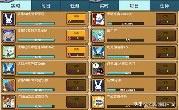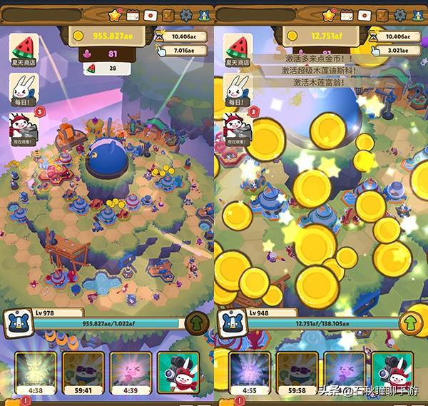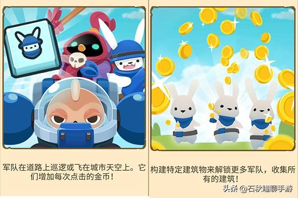 总之,这个游戏的基础玩法很简单,就是放置产金币,然后用金币建造矿场提高静态收益,然后再在岛上建造房屋,增加兔子军队,这样点击收益也能提高。