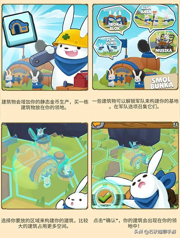 建筑物不仅可以解锁更多的兔子军队,还可以增加静态金币,也就是自动收益。前期在军队数量足够的情况下,建议先把提高点击海盗伤害的建筑物给建立起来,否则你很难打倒那些海盗。