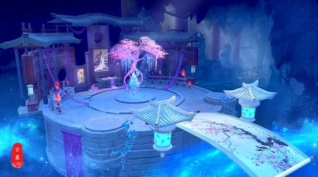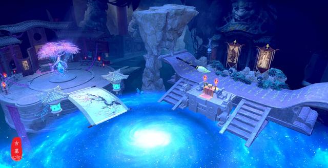 不过想来也是,这里是杨过从小长成,最后又携小龙女归隐的地方,浪漫自然是必不可少的啦~整个古墓的色调是梦幻的蓝紫色,不仅有古朴的建筑石灯,还有精致的画卷廊桥和仿佛记载了满满武功秘诀的神秘画卷。地下暗河的水仿佛倒映进浩渺星空,水晶树仿佛无根生长在空中。哪里像个阴森森的古墓,分明像个与世隔绝的世外桃源,想来也只有这样的"仙境",才能养出如小龙女那般又仙又美的江湖女子吧。
