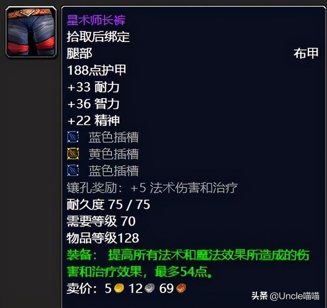 星术师长裤系风暴要塞BOSS大星术师索兰莉安出品。此款法系输出裤子可谓是非常的经典了,耐智精齐备可谓三元汇聚引星入尘简直不要太过于高格调,而黄蓝蓝三个大插槽附送5点法伤也是绝对的安逸巴适,至于54点的法伤的话也是属于上乘水准,真的要说点什么毛病的话那么也就是不加点法术爆击啊法术命中啊啥的,其他的话基本没毛病,推荐指数9颗星。