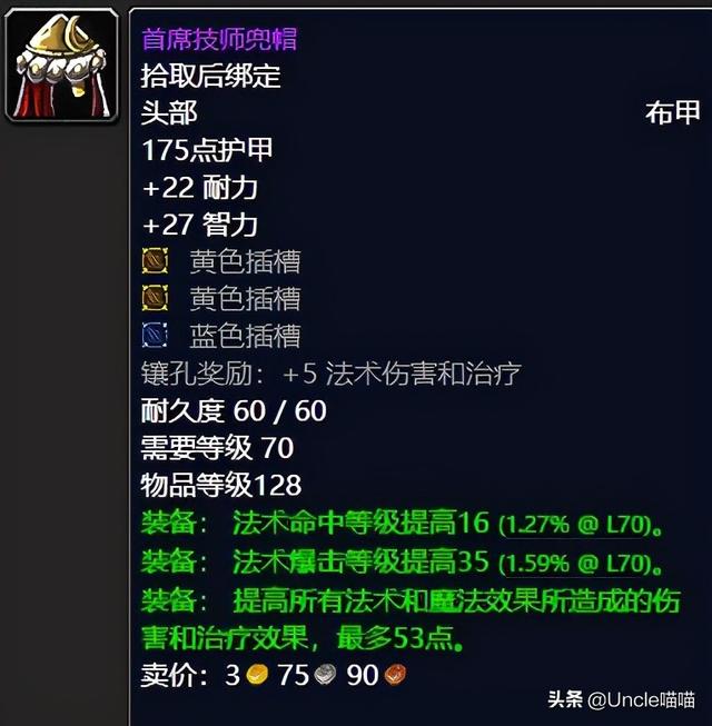 首席技师兜帽系风暴要塞BOSS空灵机甲出品。专业首席技师必备兜帽你值得拥有,高端耐智已然非凡,黄黄蓝三大插槽可谓经典,强力法术命中提高可谓一流水准,超强法术暴击等级提高可谓恐怖如斯,而53点的法伤加持直接不落俗套输出直接爆表,巅峰法系头部装备你值得拥有,推荐指数满天星辰直戳天花板。