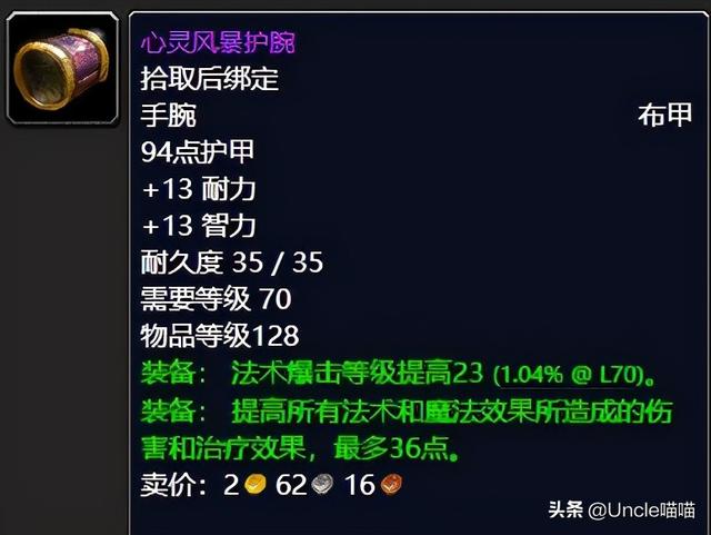 心灵风暴护腕系风暴要塞BOSS奥 <凤凰之神>出品。震撼你的心灵,让你感受风暴一般的力量与爆击堪称经典护腕。虽然属性智耐各13点真的有那么一丢丢的13,但是就冲着它那高端的23点法术暴击等级提高以及36点的法伤加持也足以让你无话可说,经典护腕震惊心灵你值得拥有,推荐指数10颗星。