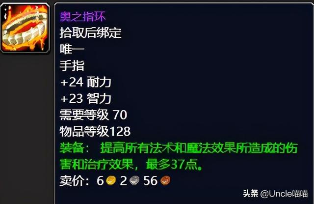 奥之指环系风暴要塞BOSS奥 <凤凰之神>出品。此款浴火重生的戒指堪称经典法系输出戒指了,智耐齐备可谓是非常棒棒哒了,最为重要的是37点的法术伤害加持让你输出直接更上一层楼,推荐指数9颗星。
