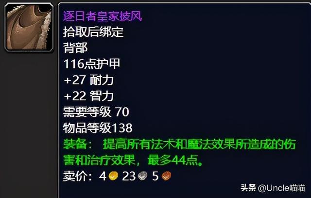 逐日者皇家披风系风暴要塞终极BOSS凯尔萨斯·逐日者 <血精灵之王>出品。经典超强法伤加持的逐日者皇家披风绝对是你不二的选择,此款披风乃是皇家御用之品,采用了最为高端的绫罗绸缎经过九九八十一道工序精心打造而出,只为最强力的你,推荐指数满天星辰。