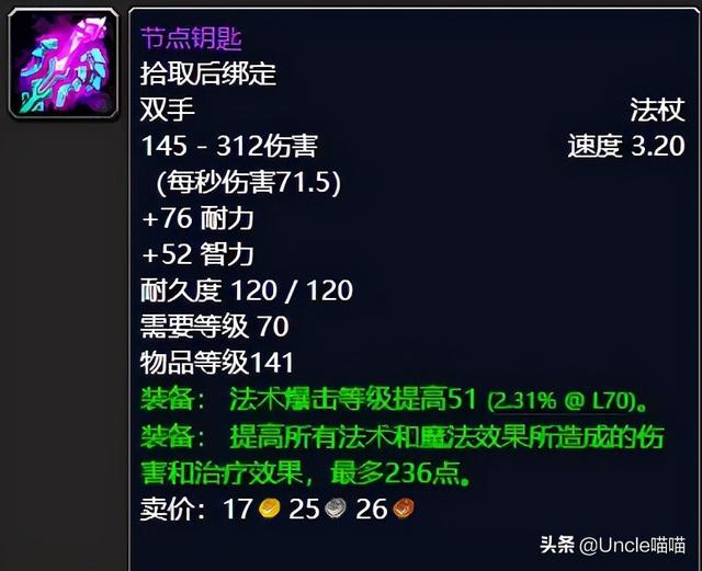 节点钥匙系风暴要塞终极BOSS凯尔萨斯·逐日者 <血精灵之王>出品。这款经典的超高法术暴击等级提高的法杖在于前期还是非常的经典的,76点的耐力真心给力直接血线拉满,而52点的智力也是不遑多让堪称经典,51点的法术暴击等级提高直接让喵叔我无言以对简直给力,至于236点的法伤加持也是属于上乘水准,造型方面的话也是非常的好看极具风格,推荐指数满天星辰。