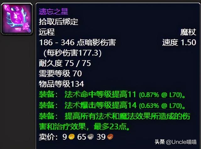 遗忘之星系风暴要塞BOSS大星术师索兰莉安出品。这款魔杖遗忘之星可以说是堪称毕业级别的极品法系输出魔杖了,虽然没有任何的属性加持,但是法术命中与法术暴击等级提高出现在同一个魔杖上面真心稀有,而且法伤的话23点也是非常的可观,经典魔杖法系输出必争之品,推荐指数满天星辰直戳天花板。