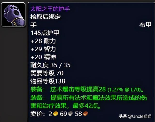 太阳之王的护手系风暴要塞终极BOSS凯尔萨斯·逐日者 <血精灵之王>出品。法系输出经典爆击手套你值得拥有,虽然没有插槽加持但是免费送了精神也着实不错难能可贵,28点的法术暴击等级提高也是一等一的加持了,42点的法伤加持在这个阶段绝对是扛把子水准,推荐指数10颗星。