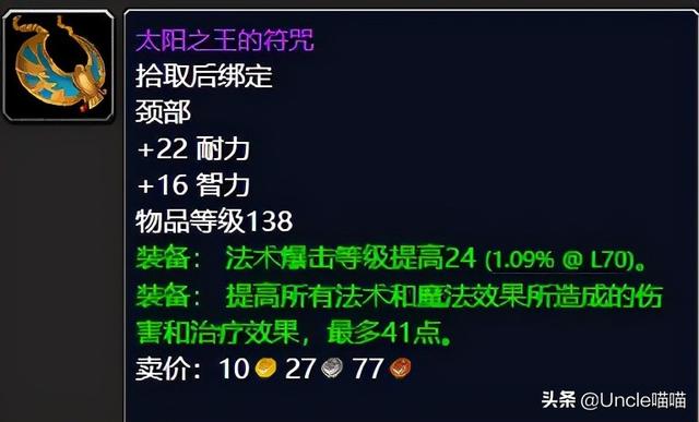 太阳之王的符咒系风暴要塞终极BOSS凯尔萨斯·逐日者 <血精灵之王>翠绿的魔珠任务换取。经典项链太阳之王的符咒可以说是法系必须换取的了,智耐齐备可见一斑,高端24点的法术暴击等级提高可以说是前无古人后无来者非常NICE,41点的法伤加持对于一个项链来说已然天花板,经典项链你值得拥有,推荐指数满天星辰直戳天花板。