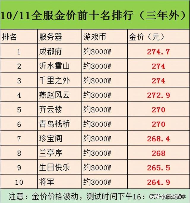 最近统计的全服金价前十的服务器排名,成都府战胜了沂水雪山,成为了排名第一的服务器,3000W的比例达到了274.7,后面紧接着是老牌服务器沂水雪山,后面是千里之外、燕赵风云、齐云楼、青岛栈桥、珍宝阁、兰亭序、生日快乐、将军等,现在像老牌的生日快乐跟2008服务器,都排在比较靠后的位置,2008都没上排名,真的是江山代有人才出,各领风骚数百年呀!