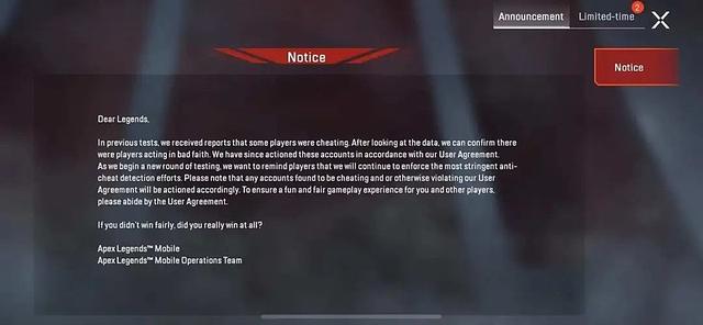 最后还需要一提的是,《Apex Legends》原作因为外挂横行的问题曾经热度骤降,现在这个情况似乎蔓延到手游上来。今日游戏开启测试还不到一天,官方就收到反馈称玩家遇到了对手开挂的行为。