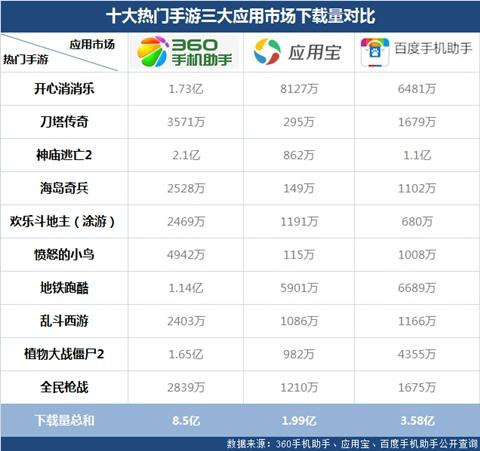 日前,媒体曝光了最热门的十款手机游戏在360手机助手、应用宝、百度手机助手三大应用商店上的下载量数据,数据显示,在这三大应用商店中,360手机助手的手游下载量最高。紧随其后的是百度手机助手,应用宝位列三甲中的末位。