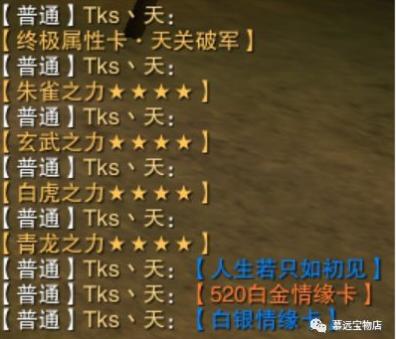 卡片暗金四张神兽卡,一暗金天关破军刺破卡,一橙色情缘卡,两蓝色卡片。