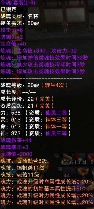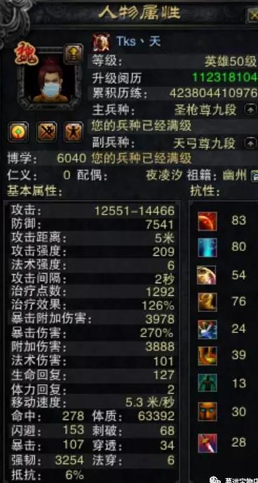 生命未知,商会长老,仁义未上榜。护卫一神猴两貂蝉,橙色披风,斩魂加9双11。君主套,刺破三,攻击265,防御150,生命650,爆抗5。祖籍幽州,金色差一点。天命的图片不清晰,自己看他的天命吧!攻击500多,防御应该是160多,生命不知道是八千八百多,还是六千八百多。