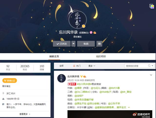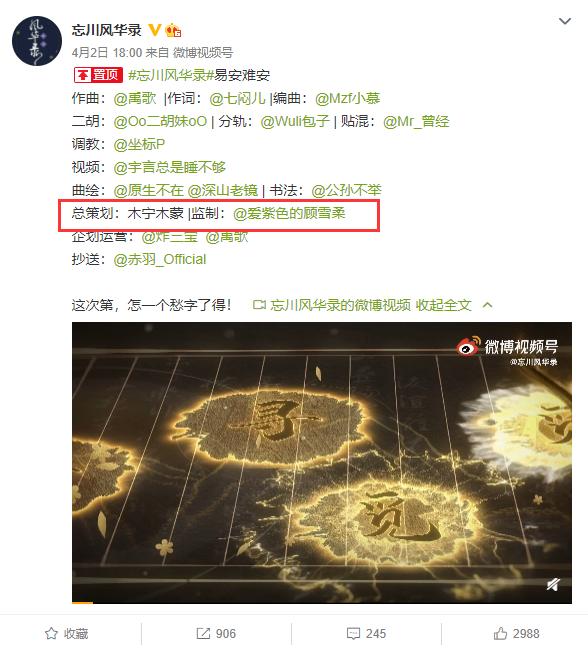 而关于音乐企划的其他核心成员,如总策划 木宁木蒙 ,无法查到任何信息,所以推测此ID为杜撰的虚假ID,真实身份极有可能是忘川手游的制作人,而监制 @爱紫色的顾雪柔 ,实为作家顾雪柔,曾用过很多马甲写过不少网文作品,真实身份很有可能是忘川手游的世界观架构师、主文案,从个人的感受来说,忘川手游的故事剧情风格和她的《乱世为王》风格多少有些相似。