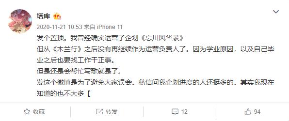 在忘川音乐企划发布的所有音乐PV里,都注明了很多企划人员的信息。其中便有一位核心企划运营成员:塔库。根据 @塔库 在去年11月发布的一条微博,他确有说明自己曾经运营了《忘川风华录》音乐企划,而且 @忘川风华录 官方微博发布的内容,也的确会直接链接到他的微博。