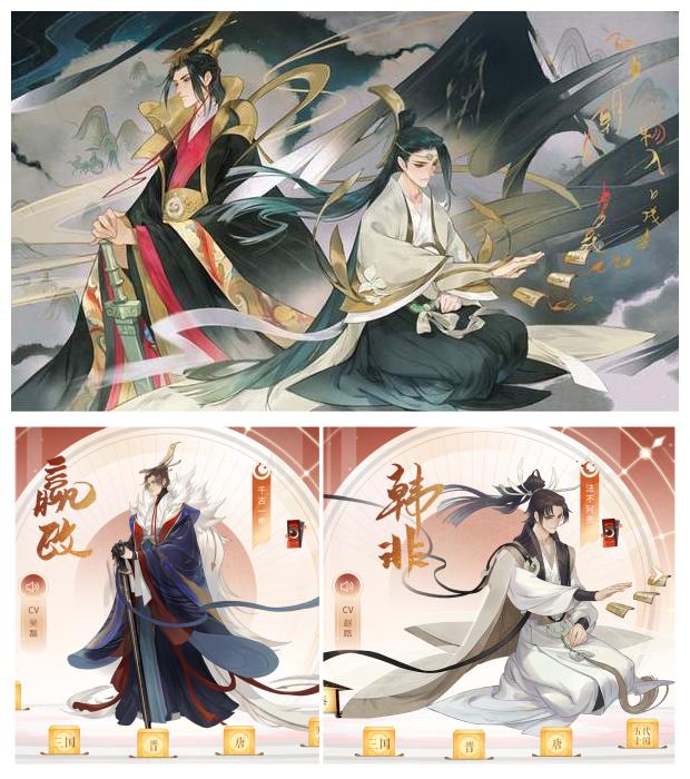 上:测试曝光的宣传图,下:忘川手游官网的嬴政和韩非人物立绘