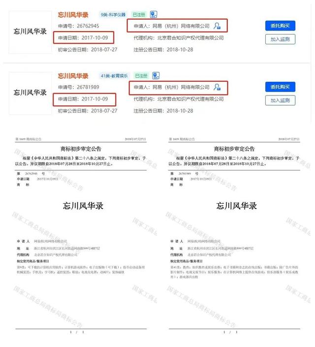 国家工商局商标局官网公告显示的关键信息在于:网易在2017年10月9日便申请了“忘川风华录”第9类、第41类商标。其中第9类商标分类0901是“计算机游戏软件”;第41类商标分类4105是“在计算机网络上提供在线游戏”。