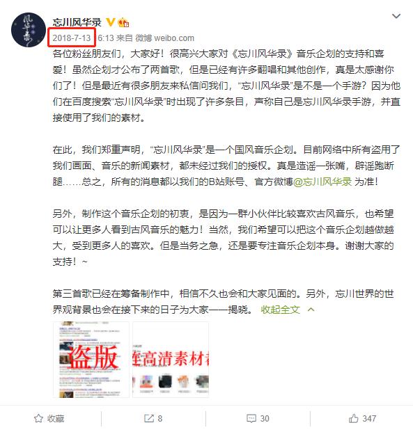 在网易官方的公告中,忘川音乐企划是一个同人内容创作的IP团队,由他们授权给了手游项目进行的IP改编,忘川音乐的官方信息也“印证”了这一点。