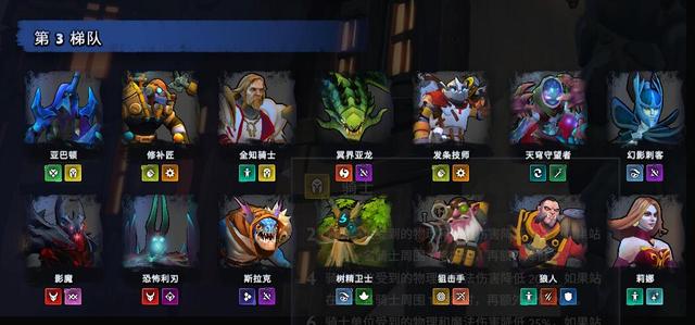 一些英雄的所属联盟和梯队被更改,现在潮汐猎人变为紫色英雄且不再是“猎人”而是“勇士”,美杜莎变为了金色英雄且分裂箭技能加强。,、猎人体系不在像以前一样强势,潮汐猎人的控制能力也被削弱,但这样的改动使勇士体系有了对抗法师的能力。剃刀从蓝色英雄改为白色英雄,现在太古联盟能缴械远程单位,还更容易凑齐。