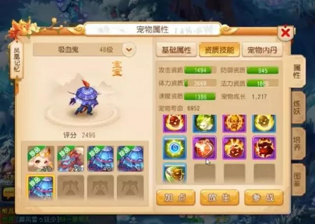 首先号主已经准备好了一个7技能的吸血鬼,必带的技能也已经被垫掉了,这只吸血鬼的资质和成长还是蛮不错的,那么接下来我们看另外一个宠物。