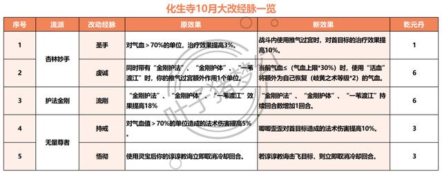 本次对于化生寺“杏林妙手”流派调整主要在推气过宫和对自身回血上,“护法金刚”流派略微下调了辅助能力,“无量尊者”流派的调整则是提升伤害,影响不大。