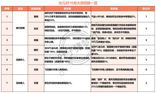 本次对女儿村三个流派的改动非常有意思,“绝代妖娆”流派不仅略微提高了封印能力,还附加了一个“起盾BUFF”,这对于猴哥来说将是极大的加强。“花雨伊人”流派调低了女儿村的任务封印能力,不过附加了一个飞花摘叶不耗蓝的BUFF,抓持国、刷场景的话会很开心。至于“花间美人”流派,只是增加了一个驱散BUFF,算是不痛不痒的加强。