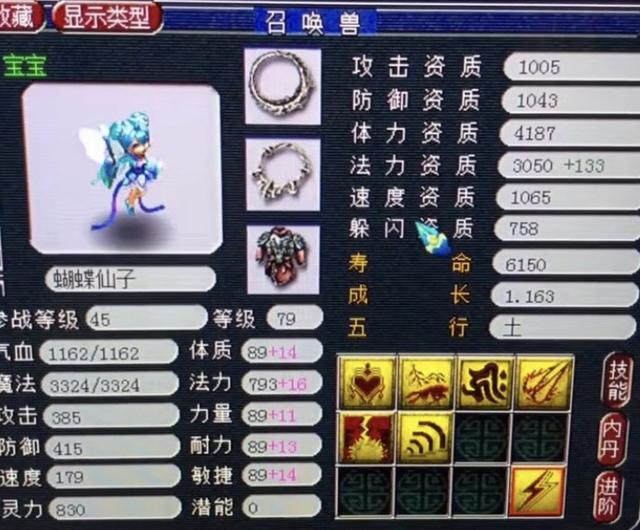 看上面这个3183的法力资质,小编一开始还以为这是一只混沌兽呢!作为个性须弥宝宝这样的法力资质可以说已经到达巅峰了,玩家选择的是暴力纯魔加点,灵力高达830!这是小编见过79级宝宝里灵力最高的。虽然是纯魔加点,但速度也达到了179,可以想象到宝宝装备有多极品,如果最后带的是高级敏捷套装的话那就太完美了。