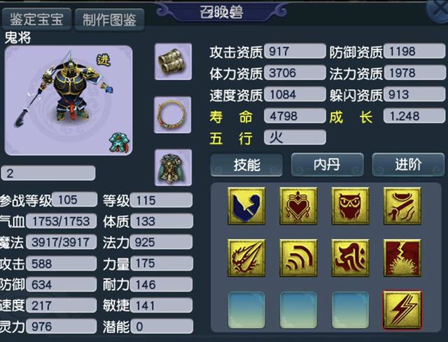 以上图片是一位来自沂水雪山粉丝的投稿。这只鬼将认证后有9个技能,目前已经成品,只是1900+的法资和一本蓝书显得有些掉档次,后来了解到这只鬼将2018年还没吃元宵!原来玩家一直犹豫要不要把这只鬼将搏成全红,如果须弥掉了的话那这只宝宝就只能回炉,所以就没吃元宵。