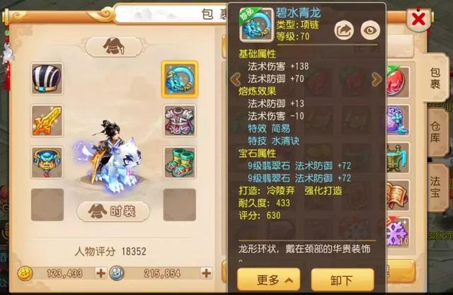 双蓝字的70级项链,简易+水清诀,大家可以看到他的这个熔炼效果,法术防御近满值,但由于方寸玩家不是很注重法术伤害,所以法伤这个属性的熔炼就直接忽略不计吧~不过两颗9级翡翠石也是准备到位的,很不错的一个装备。
