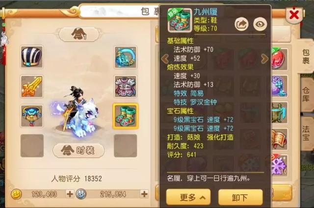 第六件装备是一个70级的鞋子,只有两个字能形容,那就是超强!不仅仅是因为它是双蓝字,简易+罗汉金钟的极品组合,更多的是因为,它熔炼后加了30点的速度。这是经过了多少血与泪才熔到的属性,就只有他自己知道了。