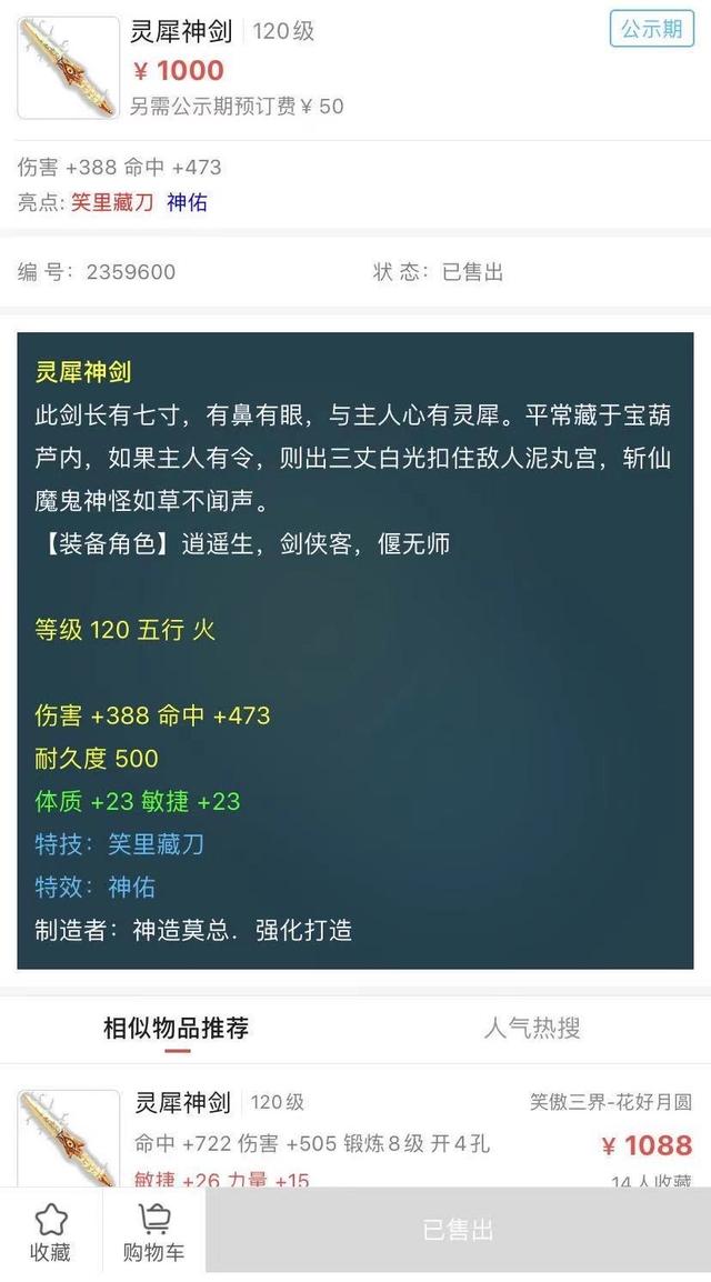 这把120灵犀神剑,简直就是为敏方寸量身打造的,双加属性达到了极限。两个蓝字也是PK中最热门的特效特技之一。这样一把武器小编曾经见过有人卖过2万块钱,而且很快就卖出去了。而这位卖家只摆了1000。自然而然就被人家瞬秒了,真替这位卖家感到不值,不知道他鉴定了多少把武器才鉴定出这么一把神器。却已如此低廉的价格卖出去,好可惜。