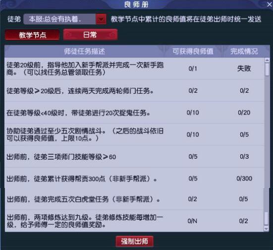 上面的就是师徒任务中师傅可以获得的教学节点,在师傅界面总共可以完成八个教学节点,这八个教学节点全部都完成师父就可以获得最高的奖励,但是这八个教学节点完成特别的困难,让徒弟在20级之前完成一次新手跑商,但是现在的角色都是自动升级的,也就是要求角色达到15级就拜师,拜师之后不做其他的事情立马去跑商,所以这一条比较难完成,然后就是让徒弟的两项修炼达到九,这就需要徒弟的角色等级达到69级,只有这样修炼才能够达到9,低于69级上限,是提升不上去的。