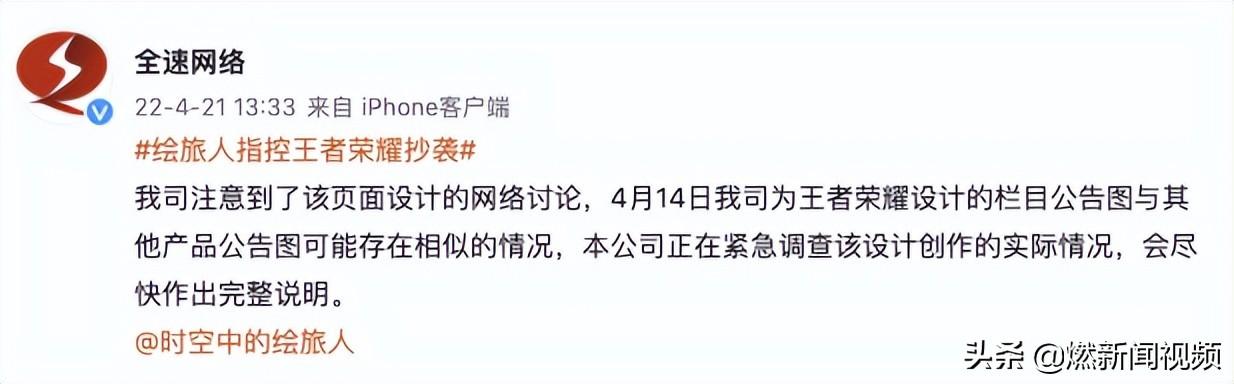 4月22日,《王者荣耀》供应商全速网络发布公告:经核实,我司美术设计人员在进行设计创作时,不存在抄袭第三方素材的行为,创作思路和灵感均来源于并参考王者荣耀已经发布的宣传物料。