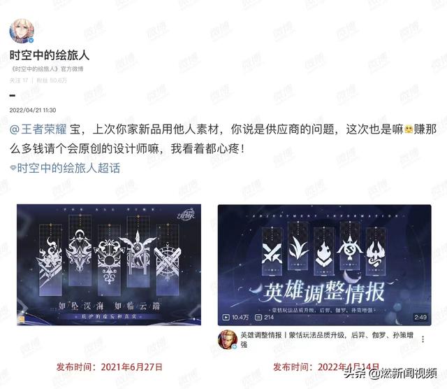 “赚那么多钱请个会原创的设计师嘛。”4日21日上午,网易手游@《时空中的绘旅人》微博发文喊话腾讯《王者荣耀》再次抄袭原创设计图。
