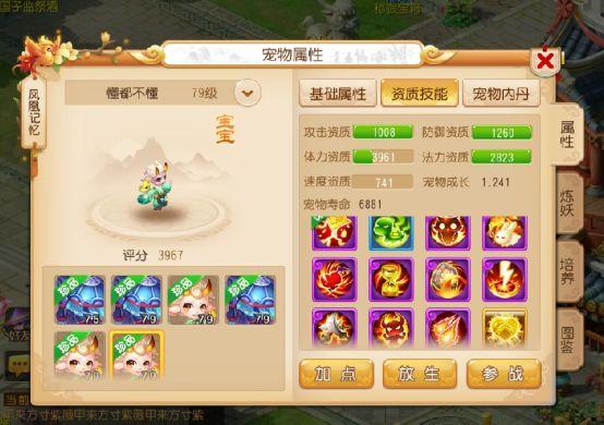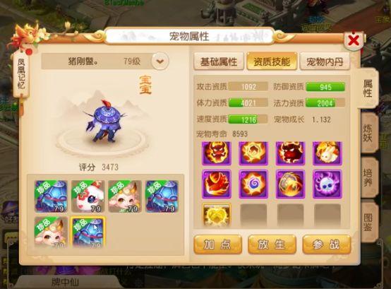 这只11技能的忘川童子就厉害了,认证了上古灵符,成长1.241,法力资质和防御资质都爆了,因其速度资质的缘故,号主将其打造成了一只龟速宠,若说它的单体法攻中的最强守尸者应该也不为过吧?