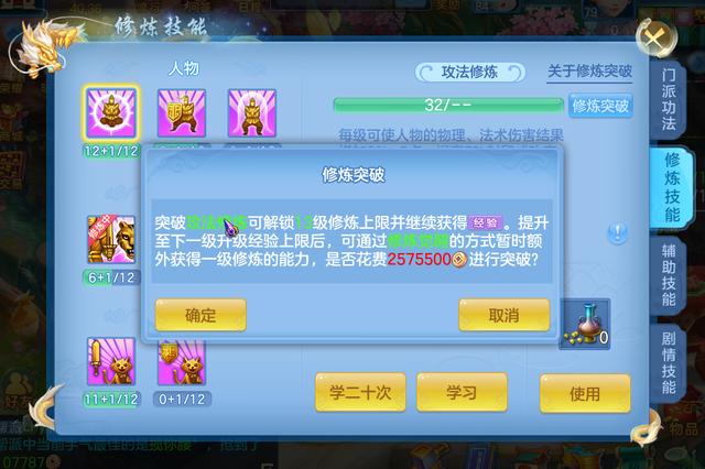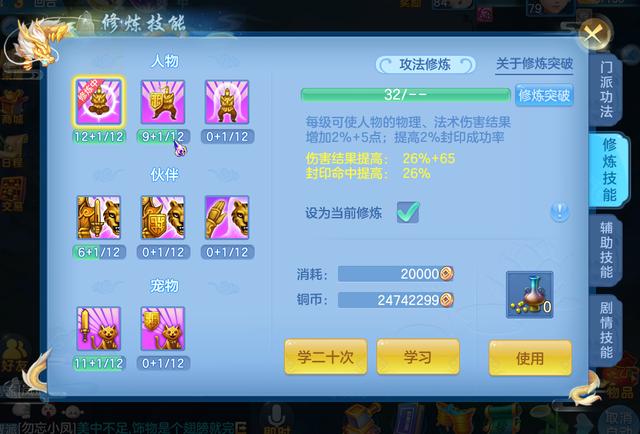 修炼经验,即是另一种形式的经验,修炼的主要作用就是提高角色、伙伴、宠物的实力。在游戏的右下角点击技能就能进入修炼技能页面,其中分成人物修炼、伙伴修炼、宠物修炼,人物修炼有功法修炼、防御修炼、法抗修炼,伙伴修炼有攻击指挥、防御指挥、法抗指挥,包括宠物修炼有宠物攻法、宠物防御。不同的修炼为玩家阵容提供的作用不同,修炼越高,则能力提升效果越强。