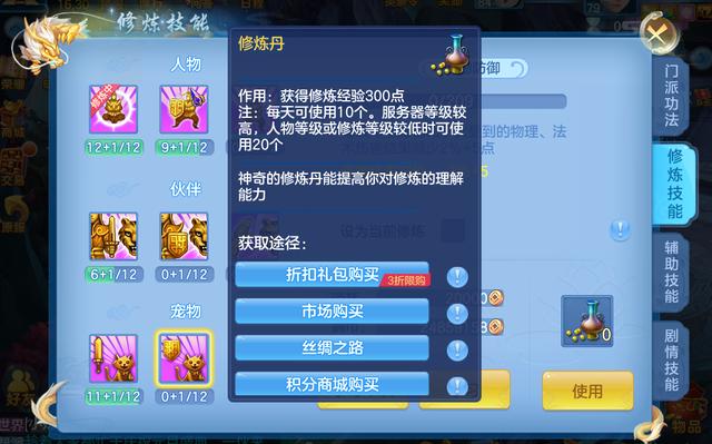 我们在修炼技能页面能看到,提升修炼技能的主要途径就是消耗大量铜币和修炼丹来提升,其中伙伴修炼是需要使用伙伴专用铜币来提升,伙伴专用铜币在日常任务的英雄试炼中就能获取。而在游戏中获取铜币的方式有很多,积极完成日常任务就能获取大量的铜币。第二种提升修炼经验的方法就是使用修炼丹,修炼丹不仅可以购买,还能在每日任务的丝绸之路中获得,还有随机在地图中刷新的修炼宝箱,玩家可以点击修炼宝箱消耗一定的铜币便可以获得宝箱中的经验和修炼经验。