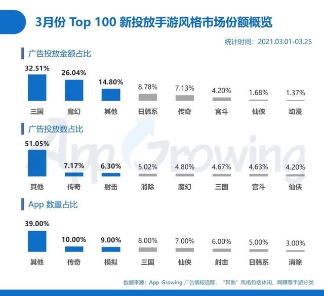 广告投放金额占比方面,三国、魔幻手游表现强势。