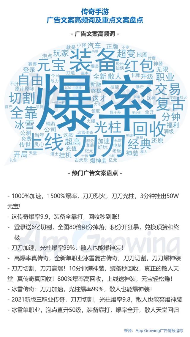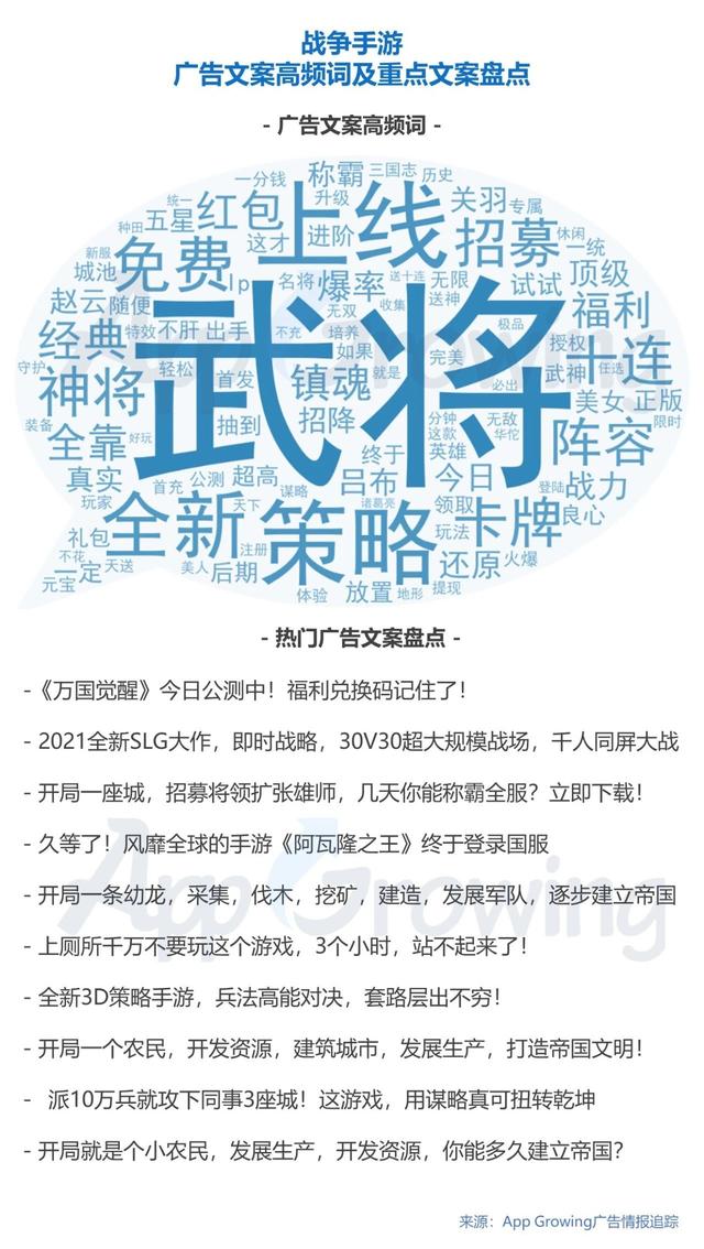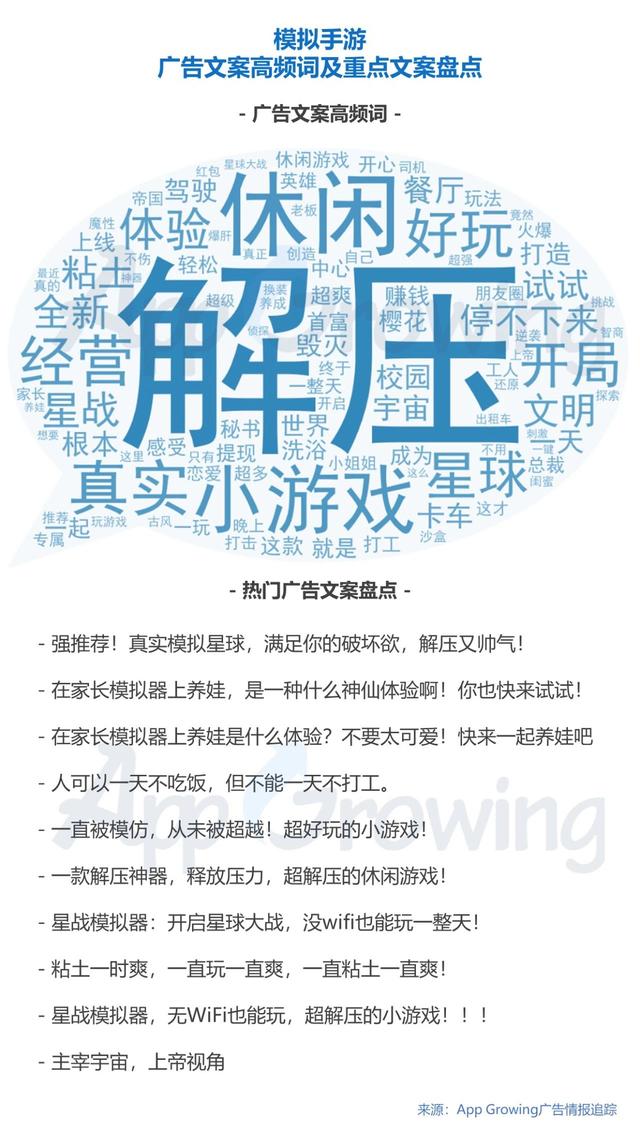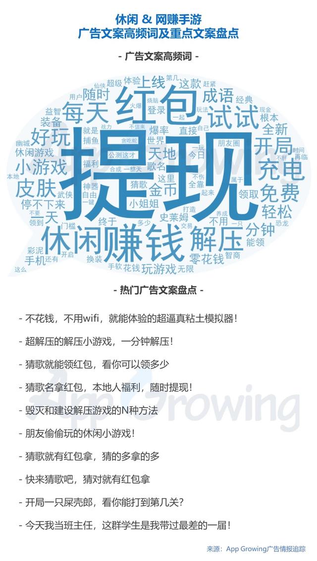 基于App Growing在3月份追踪到的移动广告情报,对不同游戏类型的广告文案进行整理,梳理出该月热推游戏风格—— 休闲&网赚、模拟、传奇、三国、战争、棋牌游戏文案高频词及热门广告文案如下。