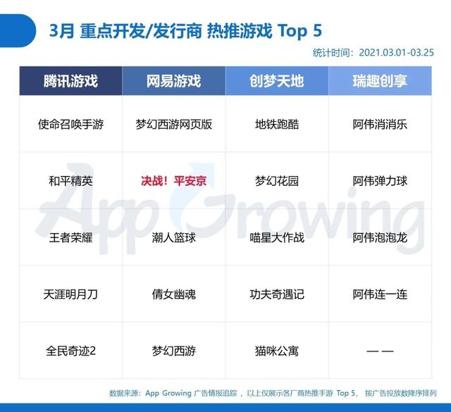 腾讯、网易作为游戏大厂,在游戏买量推广方面继续保持着优势,腾讯3月主推的还是射击手游《使命召唤手游》,网易游戏的MOBA手游《决战!平安京》开始加大买量力度,虽然游戏联动着阴阳师IP运营得还不错,但一直处于不破圈的状态,也被玩家戏称为“凉凉京”。本次在买量上面的投入,也侧面说明网易对进军MOBA手游领域还是有着一定野心。