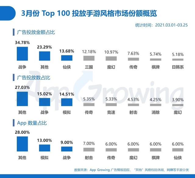无论是投放金额、广告投放数还是App占比方面,其他(主要指休闲&网赚)手游占比都较高,其次是战争与模拟。