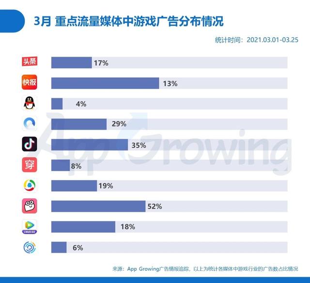 具体到流量媒体维度,皮皮虾中52%的广告来自游戏行业,游戏广告占比相对最高,其次是抖音,占比为35%。这也能侧面说明巨量引擎的人群中已经聚集起了相当一部分手游玩家,这也是字节跳动想要快速发展游戏业务的原因之一。