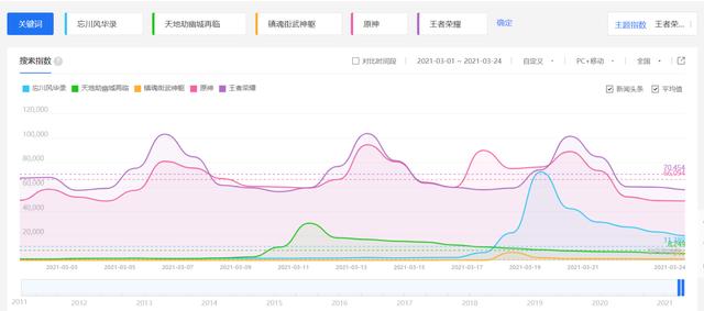 以近期比较热门的《忘川风华录》、《镇魂街:武神躯》、《天地劫幽城再临》与成绩比较亮眼的《原神》、《王者荣耀》为例,《忘川风华录》的百度搜索指数一度接近《原神》,上线不久就已经累计了2400w+的搜索结果。