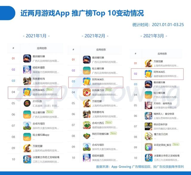 深圳创梦天地和福建瑞趣创享都以开发小游戏为主,获客方面比较依赖于广告投放,且近三个月,网赚类别的阿伟系列《阿伟消消乐》也一直位于推广榜前列并不断上升。