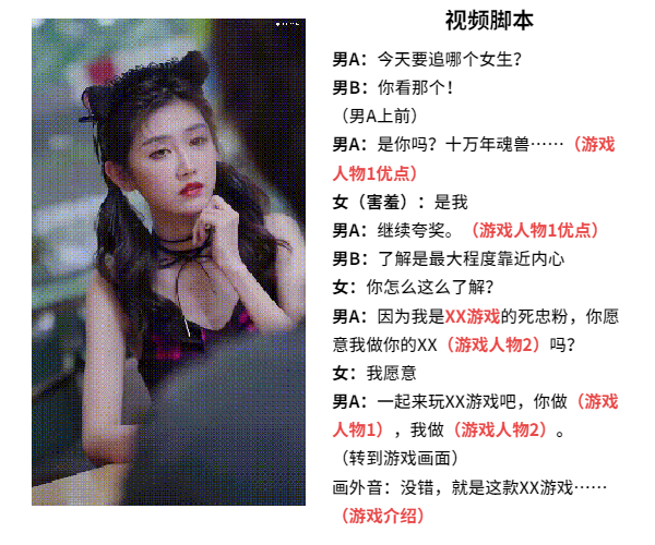 通过真实撩妹场景,无缝结合游戏中人物的优点介绍,看着像在夸女生,其实在介绍游戏中的人物特点,场景展开比较自然,剧情推进快,快速吸引用户观看。