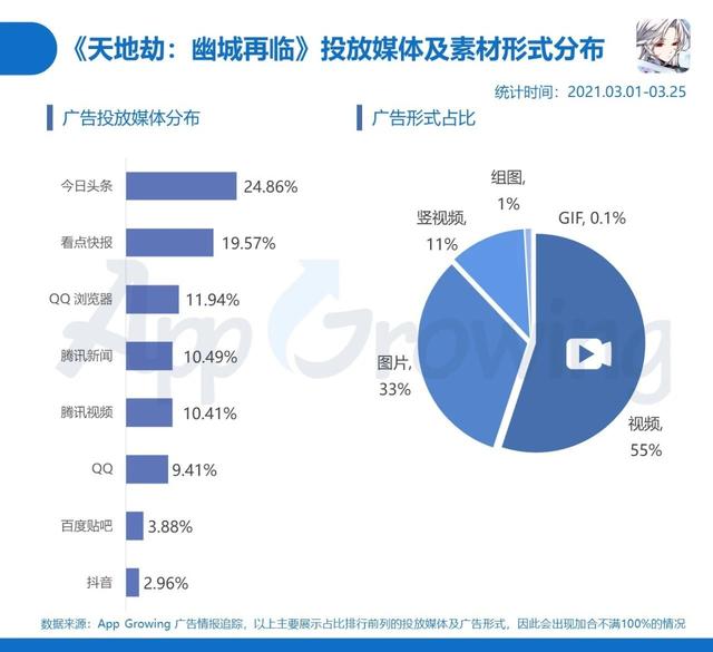 紫龙自研自发的《天地劫:幽城再临》(以下简称:天地劫)3月以来保持着高强度的广告投放状态,冲进了3月推广榜Top 5。由数据可见,《天地劫》投放的媒体类型多元,几乎所有热门的投放渠道都有涉及,投放素材主要选择视频广告。除此之外,在B站、游戏公众号中也有进行内容营销的分发,通过优质的内容和同属性的UP主来吸引相应的玩家。