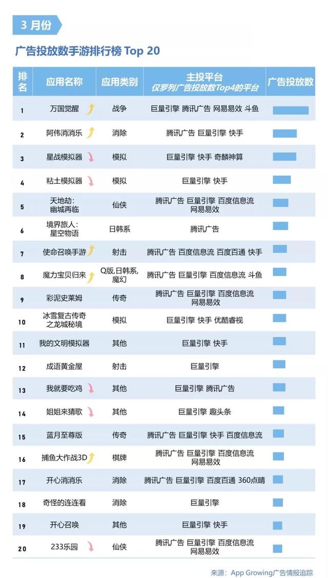 广告投放数与App数量方面依然是休闲、网赚类手游占比最高,不过相比2月来说有所下降,3月节假日少意味着用户的空闲时间相对减少,广告主也相应开始控制投放力度。