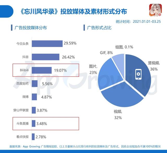 不同于专注主流媒体的《天地劫:幽城再临》,本次进入新投放手游排行榜的《忘川风华录》已经在根据自身游戏的特性,加大了B站和斗鱼上的广告投放力度。