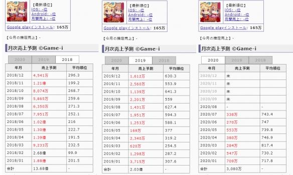 而它的日服流水在2018-2020年也经历了几次大跳水,从2018年年收入14亿日元,到2019年年收入2亿日元,再到2020年,马上停服了,7个月的氪金只有3000万日元,折合人民币约为200万。